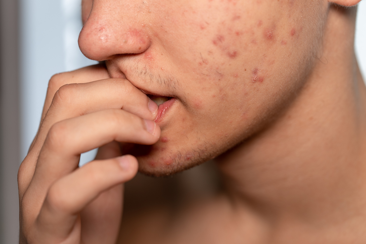 A young man with acne and pimples on his face, biting his nails.